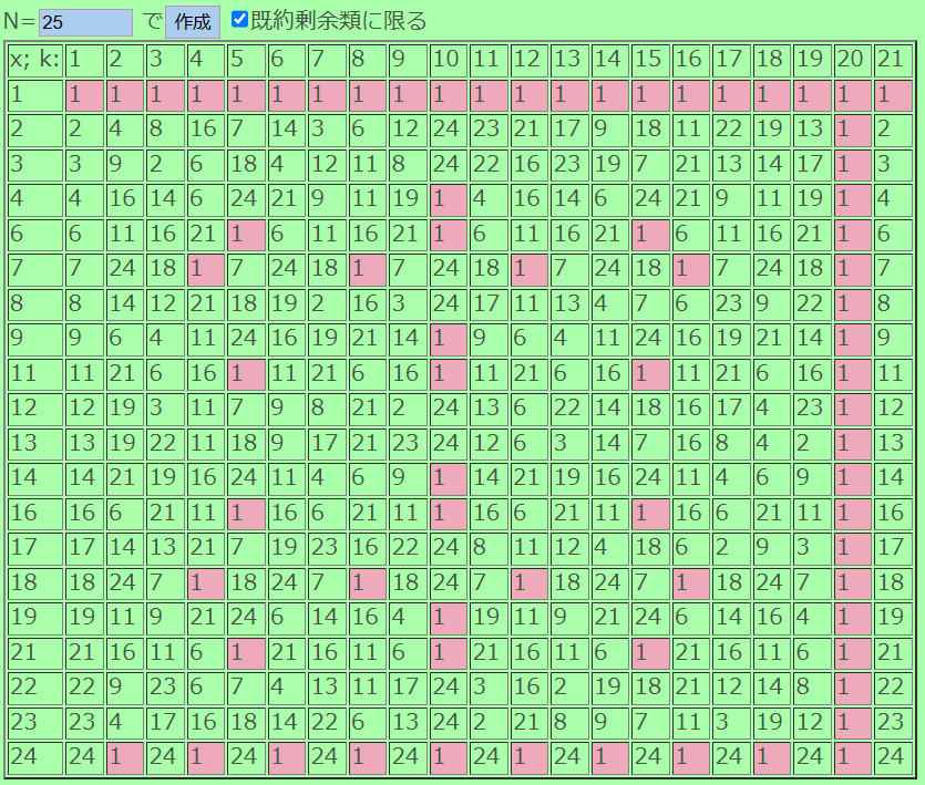 nishimuraさんのx^k(mod N)のスクリプトを使って2^kを見てみましょう。(原始根 合成数とかでググったら出てきてびっくりした)